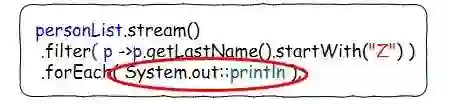 对比最开始的Lambda写法,这里已经非常非常简洁了。但是如果,我们要求变一下,变成print这个人的全部信息,及p -> System.out.println(p); 那么还可以利用Method reference来继续简化。所谓Method reference, 就是用已经写好的别的Object/Class的method来代替Lambda expression。格式如下: