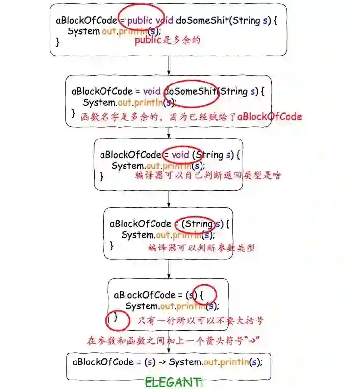 这两种写法本质上是等价的。但是显然,Java 8中的写法更加优雅简洁。并且,由于Lambda可以直接赋值给一个变量,我们就可以直接把Lambda作为参数传给函数, 而传统的Java必须有明确的接口实现的定义,初始化才行: