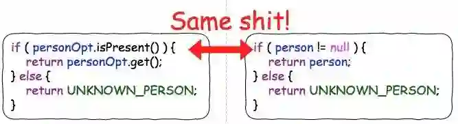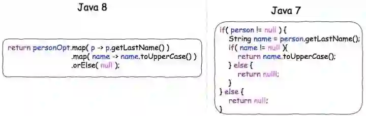 由上述四种情况可以清楚地看到,Optional<T>+Lambda可以让我们少写很多ifElse块。尤其是对于情况四那种夺命连环null检查,传统java的写法显得冗长难懂,而新的Optional<T>+Lambda则清新脱俗,清楚简洁。