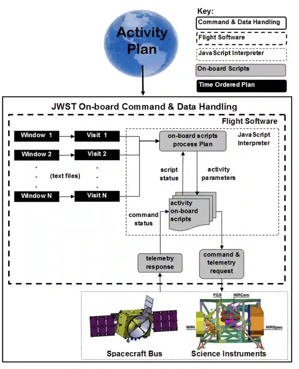 其中,板载脚本能够自动构建并向飞行软件发出实时命令和遥测请求,进而指导各 Observatory(天文台)子系统(包括科学仪器、姿态控制等)的运作。飞行软件随后会执行板载脚本发来的命令,并返回遥测数据。板载脚本对遥测数据进行实时评估,再调用脚本将状态信息发送至更高级别的板载脚本,进一步根据观测计划中的跳过逻辑对特定事件做出响应。