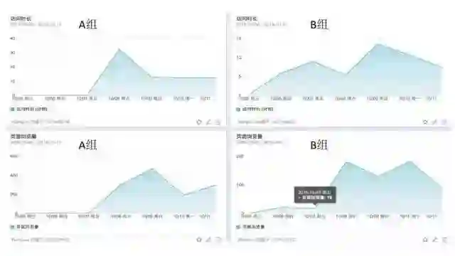 举个例子,我们设计了两种不同的产品交互形式,通过比较实验组(A 组)和对照组(B 组)的访问时长和页面浏览量两个衡量指标,来评估哪一种交互形式更佳。