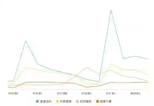 举个例子,当监测到网站流量异常时,可以通过拆分地区、访问来源、设备、浏览器等等维度,发现问题所在。图 7 中,当天网站的访问用户量显著高于上周,这是什么原因呢?当我们按照访问来源对流量进行维度拆分时(图 9 ),不难发现直接访问来源的访问量有非常大的提升,这样就进一步把问题聚焦了。