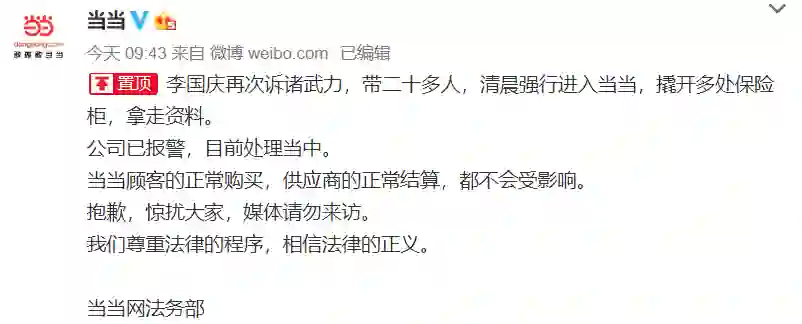【再闯当当撬开保险柜,李国庆接受警方调查】7月7日上午9时,当当网官方微博称,李国庆再次诉诸武力,带二十多人,清晨强行进入当当,撬开多处保险柜,拿走资料。公司已报警,目前处理当中。上午11时许,当当网工作人员向媒体透露,李国庆已被警方带走。随后李国庆通过微信向记者表示,在香河园派出所,“正在接受公安调查,就不接电话”。7日午间,李国庆发布微博,称当当处于依法交接时期,首要目的是保证当当的正常运营。对此,当当法务部方面发表声明称李国庆接管当当是虚假消息。7日下午,李国庆公布一份当当组织结构及人员调整公告,聘请姚丹骞出任当当代理CEO,主持公司全面工作。据新京报报道,7日晚10点,李国庆离开香河园派出所,被警车带走。