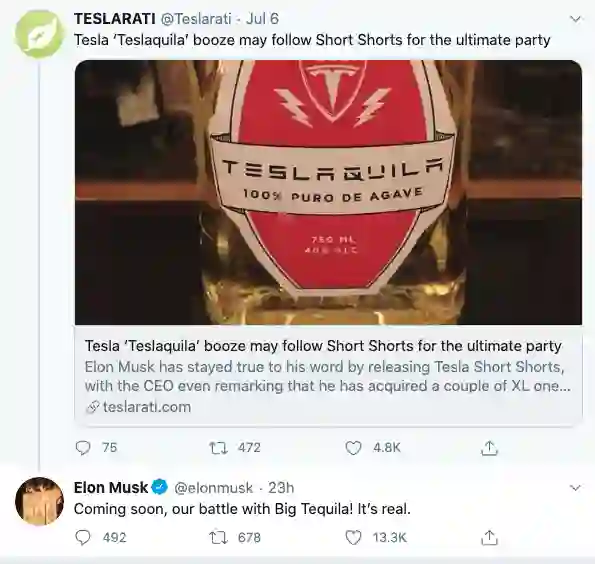 【马斯克:特斯拉牌龙舌兰Teslaquila即将推出】据国外媒体报道,特斯拉CEO马斯克透露,特斯拉牌龙舌兰Teslaquila即将推出。Teslaquila由Tesla和tequila(即龙舌兰酒)两个单词组合而成。有消息称马斯克已申请特斯拉牌龙舌兰商标Teslaquila。(TechWeb)