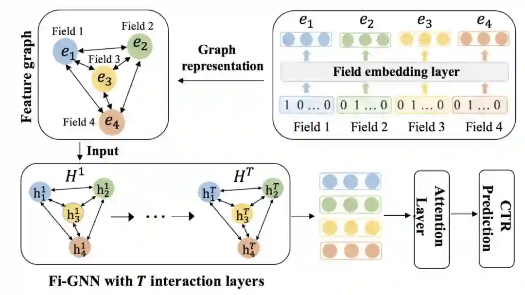 另外一个十分重要的、也与推荐系统息息相关相关的业务场景是广告点击率(CTR)预测。该场景下的样本通常是由多领域的特征数据构成,比如用户域、设备域、广告域等等,如何建模这些数据域之间的特征交互,成为了该任务的核心。最近基于神经网络的方法都是直接将各个域之间的特征拼接起来然后送到上层的网络模型中,以期得到这些域之间的高阶交互,这种简单的非结构化的拼接方式,会大大限制模型的学习能力。在“Fi-GNN: Modeling Feature Interactions via Graph Neural Networks for CTR Prediction”一文中,作者将各个域之间以图的形式连接起来(下图中的 Feature graph),然后用 GNN 建模各个特征域之间高阶复杂的交互关系,相比之前的模型取得了最好效果。