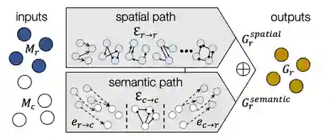 以上述构建的图为基础,使用GNN来进行推理,区域节点的特征来自卷积网络,实体节点的特征来自预训练的词向量。GNN推理是为了融合空间和语义信息对区域进行推理,因此使用了两条推理路径。一条是区域——区域,它聚合多个区域的特征以得到空间特征;另一条是区域——实体——实体,它分为两步,第一步将区域的特征聚合到实体节点并与实体节点特征融合,然后对不同类型的实体关系进行聚合得到实体的特征,这对应着语义关系。为了得到区域的最终特征,通过实体——区域的关系,将实体携带的语义特征聚合到区域节点上,并与第一条推理路径得到的空间特征进行融合。整个过程如下图所示。