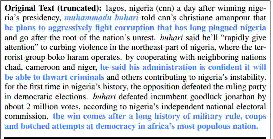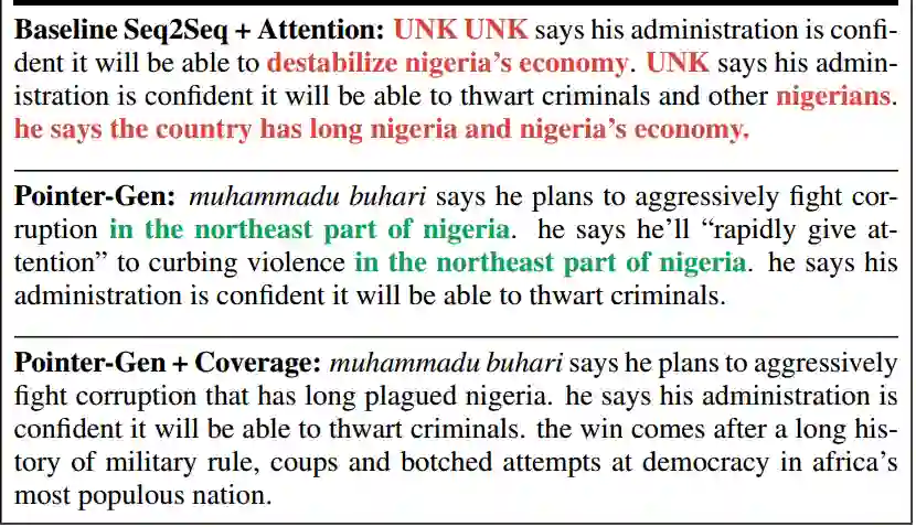 Pointer-Network:复现了原文中的词语和句子,把原文中的未登录词 muhammadu buhari 复制到摘要中,提升了准确率。但是 in the northeast part of nigeria 这段摘要重复出现了两次。