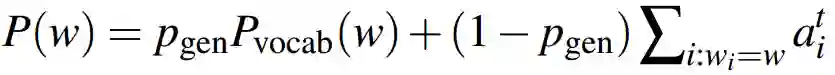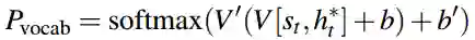 注意,公式左边的Pvocab(w)代表按原词表计算的单词概率分布,而右边的P(w)表示按加入OOV词后的新词表,计算的单词概率分布。