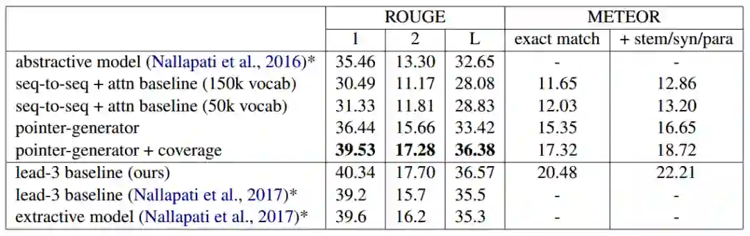 以ROUGE F1为评价指标,指针生成网络以较大的优势,超过了其他生成式摘要模型。