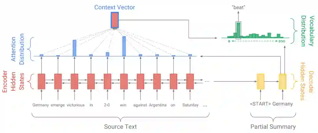 首先像Seq2Seq+Attention那样,计算注意力分布、上下文向量和基于原词表的单词概率分布。
