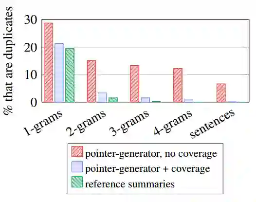 此外,论文运用Coverage机制,对已经出现在摘要中的词语,降低其注意力权重,从而降低其再次被生成的概率,在解决摘要语句重复的问题上,取得了不错的效果。
