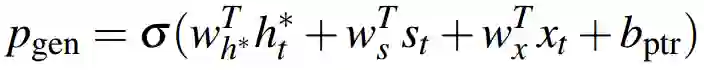 在第t步,这个概率由上下文向量、Decoder的隐状态和Decoder的输入,经过一个sigmoid函数计算而得: