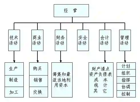按照亨利·法约尔的说法,无论哪种类型的企业,经营的过程中都会面临这6种活动:技术活动、财务活动、会计活动、商业活动、安全活动、管理活动。