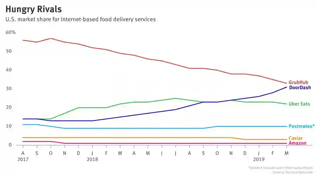 目前 DoorDash 及其竞争对手 Grubhub、Uber Eats 并未公布其成本等财务数据,但其市场占有率在不断飙升。