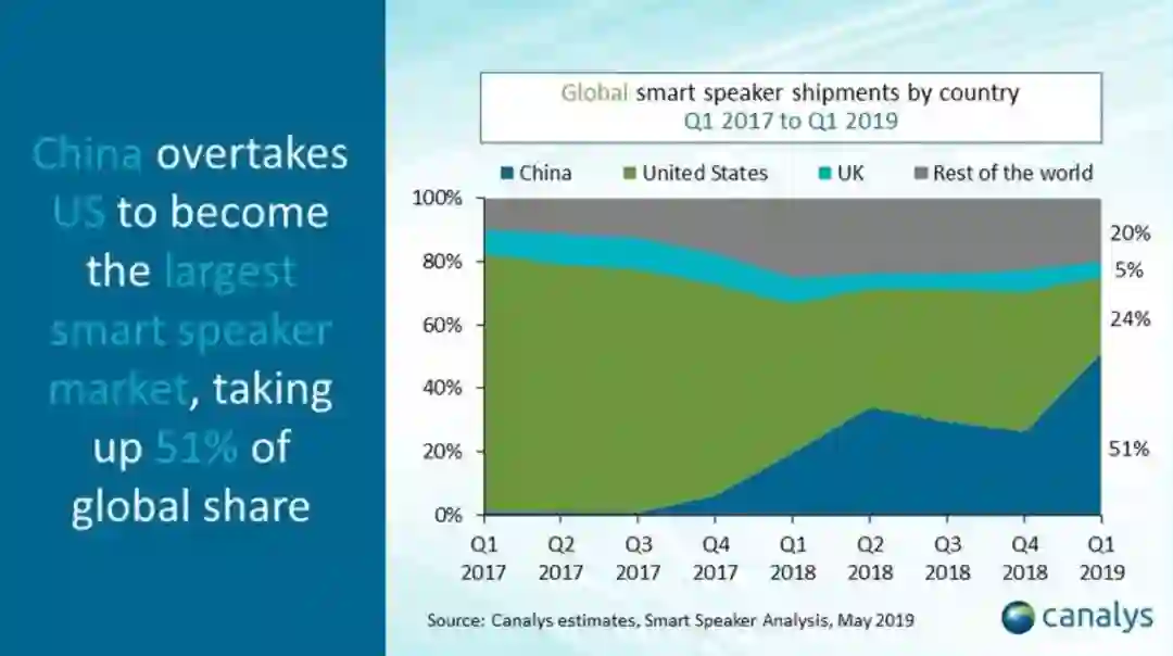 市场研究机构 Canalys 5 月23号发布的最新数据显示,中国已超越美国成为全球智能音箱市场的领头羊。该公司发现,2019 年第一季度,中国智能音箱出货量增长了 500%,市场份额达到 51%。