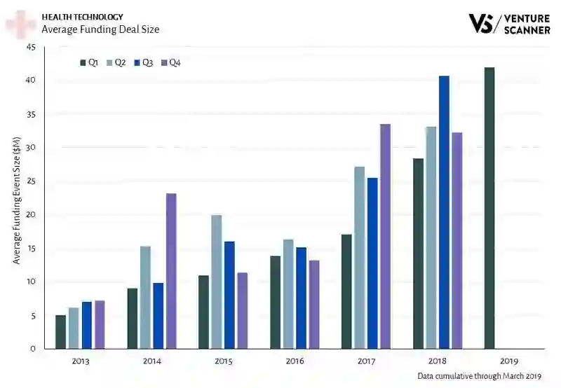 Venture Scanner 数据显示,在 2019 年第一季度,健康类初创公司平均融资交易规模为 4200 万美元,比上一季度的 3200 万美元增长了 30%,平均融资交易规模显示出强劲的向上增长趋势。其中,2018 年第四季度全球健康类初创公司平均融资额比五年前增长了约 5 倍。