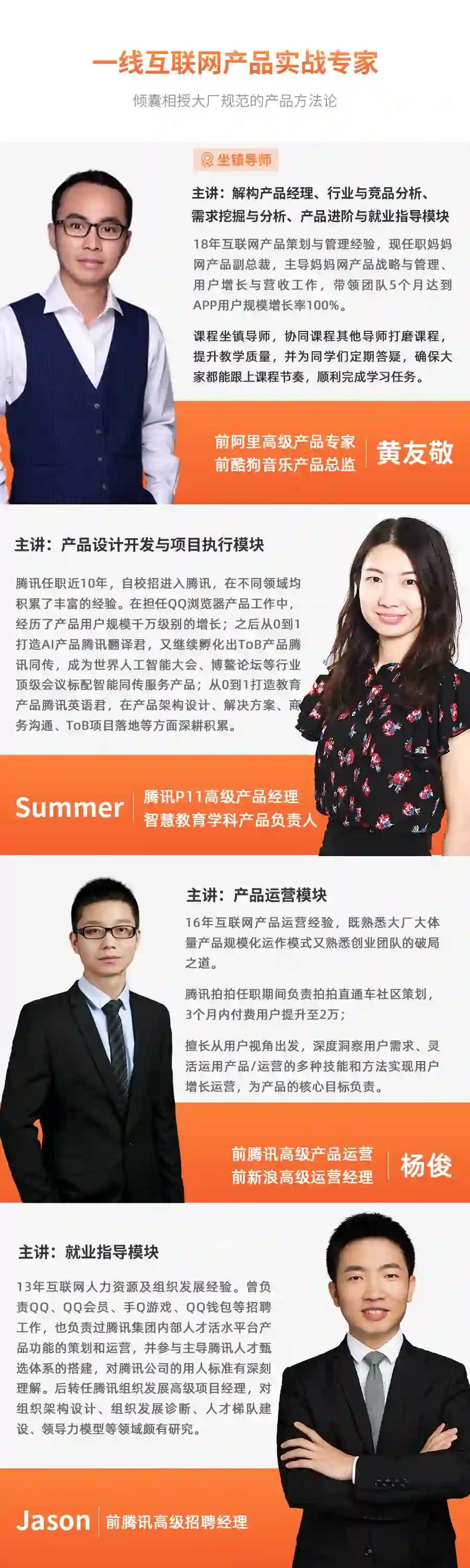 《90天产品经理实战班》的导师都来自腾讯、阿里、百度、华为等大厂,平均工作年限在10年+以上,都是久经沙场的老兵。