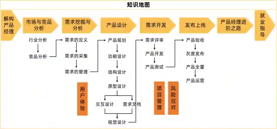 从行业分析-竞品分析-需求挖掘与分析-产品设计-项目管理-产品运营,体系化地讲解整体知识结构,全方位覆盖产品知识,内容完整。具体如下: