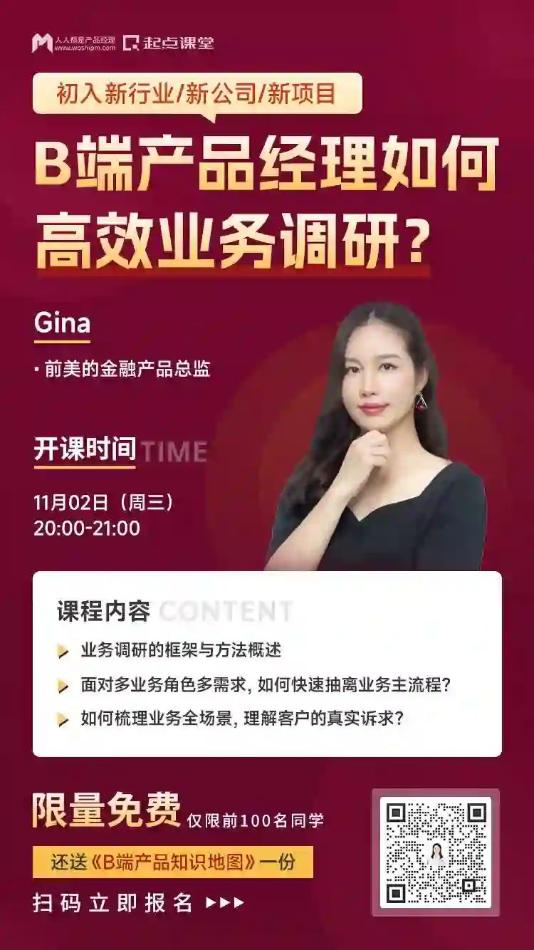 这是由起点课堂出品的B端产品公开课,专为正在做B端产品同学,或者对B端产品感兴趣想要了解相关工作内容的同学打造,课程将由前美的金融产品总监@Gina老师直播授课。