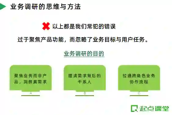 这个部分,老师会盘点梳理日常工作中,做业务调研的错误思路,并教大家正确的调研思维与方法。