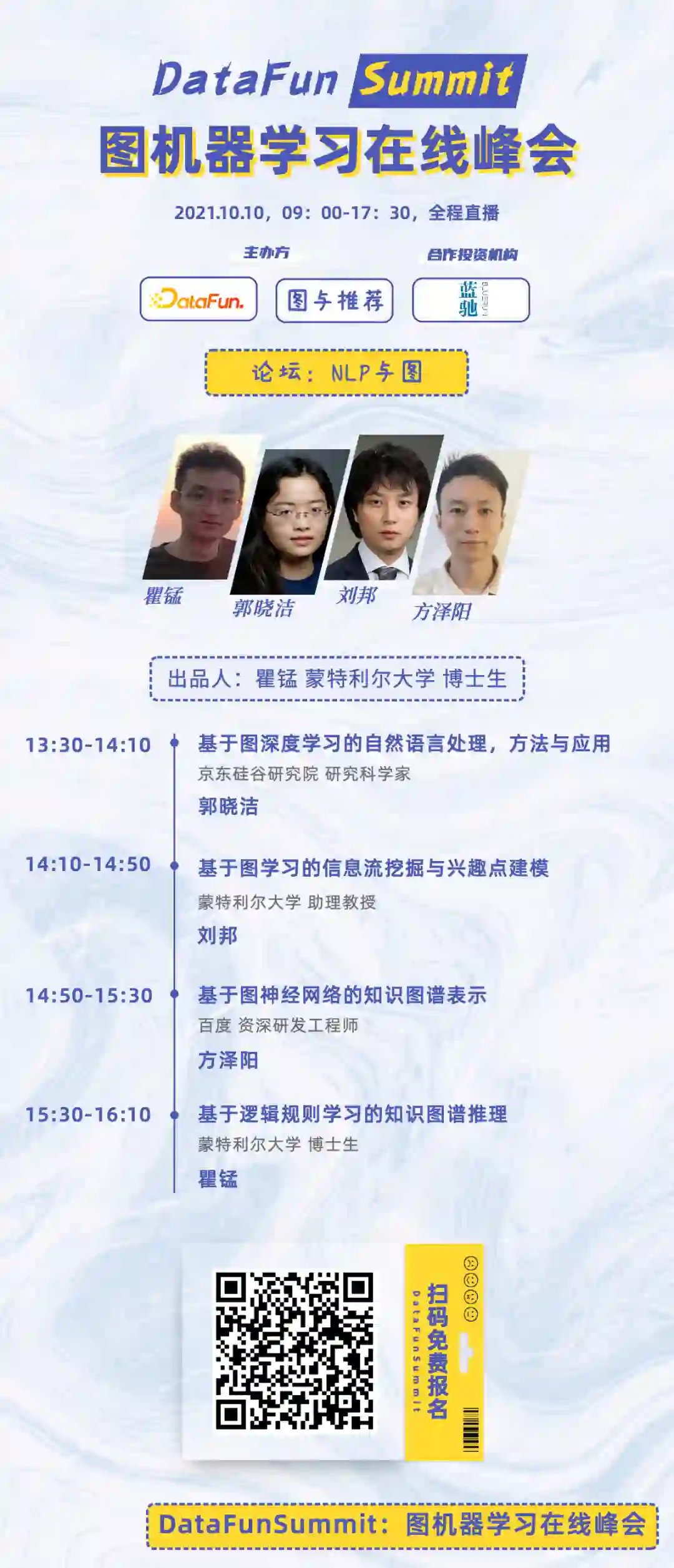 议题介绍:图是一种可用来描述和建模复杂系统的通用语言。图在NLP的世界里无处不在,比如用来描述句法信息的dependency tree和constituency tree,以及描述语义信息的AMR graph。相比于简单地把自然语言建模成词袋(bag)或者序列(sequence),图能捕捉到自然语言更丰富和细致的信息。因此,对于许多NLP任务而言,图是一种非常合理的表示方式。例如,对于跨文本阅读理解任务,如果能够抽取出文本中的实体信息,并以图的形式建立起它们之间各种联系,将能有效帮助文本理解。而图神经网络(GNN)恰恰最擅长处理和建模图结构数据的。近年来,深度学习已经成为NLP领域的主要技术手段。在GNN被引入和广泛应用之前,深度学习领域一直缺少一种神经网络架构,能够像CNN适合处理网格数据那样,适合处理任意图结构数据。随着GNN研究的持续火热,越来越多的研究开始尝试用GNN来解决各类NLP问题。本次分享将从 NLP 图构建、NLP图表示学习、基于 GNN 的 Encoder-decoder 模型和 GNN 在 NLP 中的应用这四个维度对近年来图深度学习在 NLP 中的研究进展进行梳理和总结。此外,郭晓洁博士还会介绍团队开发的 GraphNLP,即首个针对 NLP 任务的 GNN 开源库。