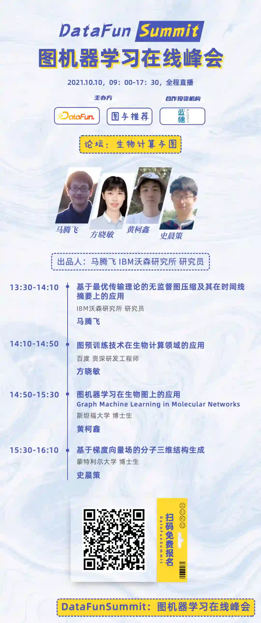 个人简介:马腾飞,IBM沃森研究院研究员,本科毕业于清华大学,随后分别于北京大学和东京大学取得硕士和博士学位,研究方向为机器学习、自然语言处理和智能医疗等。他深耕图神经网络多年,近期的研究主要集中在图神经网络的可扩展性、生成模型及其在医疗、生化、自然语言处理等领域的应用。他在NeurIPS、ICLR、AAAI等人工智能国际会议上发表论文40多篇,在AAAI与KDD等会议上多次讲授关于图神经网络前沿的专题;他也是图神经网络科普书籍《图神经网络:基础与前言》的作者。