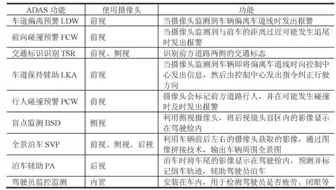 通过对采集图像进行计算机算法分析,车载摄像头能够识别行人、自行车、机动车、道路轨迹线、路牌、信号灯等环境信息,进而支撑实现车道保持辅助、车道偏离预警、前向碰撞预警、行人碰撞预警、全景泊车、驾驶员疲劳预警等功能。根据安装位置不同,车载摄像头可分为前视、侧视、后视以及车内监控 4 类(见表 1)。