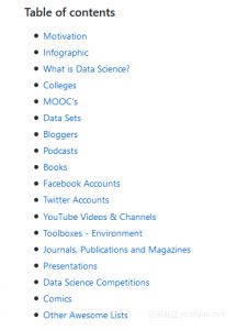 这个GitHub是数据科学的资源指南,它是建立在多年来的积累贡献,从引导指南、信息图表到人们在Twitter,Facebook,Instagram等社交网站上的资源链接,其中有很多资源可供观看,无论是否你是初学者还是老手。