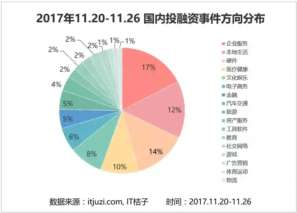 上周 IT 桔子共收录了 81 起国内投融资并购事件,覆盖 17 个行业领域。其中企业服务、本地生活领域成为上周投融资事件最多的行业,其次是硬件和医疗健康领域。