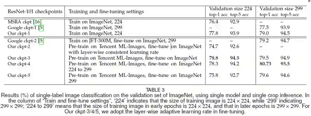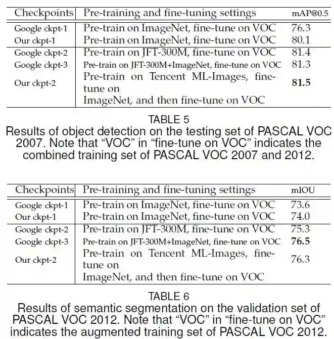 我们通过迁移学习三种不同的视觉任务,证实了Tencent ML-Images和其预训练的检查点有着比较好的质量。