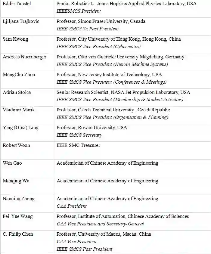 请您于5月31日前将参会回执(附件)以电子邮件提交至会务联系人(caa@ia.ac.cn)。IEEE SMC学会重量级嘉宾亲临会场,参会名额有限,欲报从速。