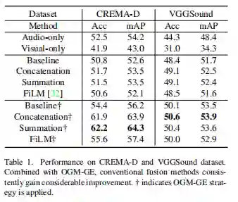 本文在CREMA-D、Kinetics-Sounds、VGGSound、AVE四个数据集上进行实验验证。首先将OGM-GE应用于几种普通的融合方法:基线、连接和求和,以及专门设计的融合方法:FiLM[32],然后评估在多个数据集上的性能,如表1所示。