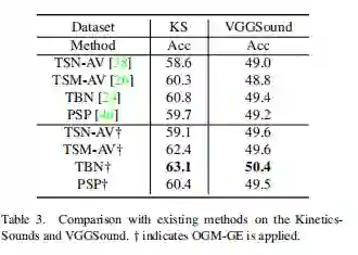 在表3中,可以发现OGM-GE加强了这两种方法。此外,如前所述,OGM-GE并不局限于音频和视觉编码器在融合过程之前没有交互作用的模型配置。