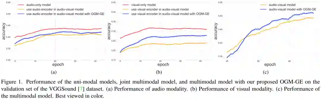 如上图(a)、(b)所示,audio-vision模型在VGGSound数据集的验证集上均逊于audio-only、vision-only这两个单一模态的模型。还有另一点值得注意的是,与audio-only模型相比,vision-only模型的准确度下降得更明显,这与 VGGSound (一个精心策划的面向声音的数据集)更喜欢音频模态的事实是一致的。一般来说,这样的数据集偏好通常会导致一种模态占主导地位,从而导致这种优化不平衡的现象。