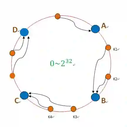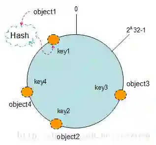 按照常用的hash算法来将对应的key哈希到一个具有2^32次方个桶的空间中,即0~(2^32)-1的数字空间中。现在我们可以将这些数字头尾相连,想象成一个闭合的环形。如下图