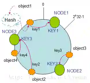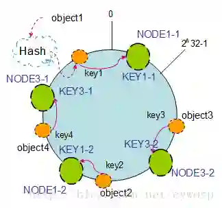 通过按顺时针迁移的规则,那么object2被迁移到了NODE4中,其它对象还保持这原有的存储位置。通过对节点的添加和删除的分析,一致性哈希算法在保持了单调性的同时,还是数据的迁移达到了最小,这样的算法对分布式集群来说是非常合适的,避免了大量数据迁移,减小了服务器的的压力。