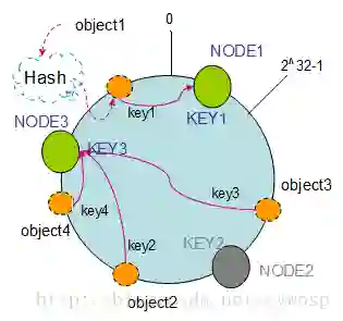 以上面的分布为例,如果NODE2出现故障被删除了,那么按照顺时针迁移的方法,object3将会被迁移到NODE3中,这样仅仅是object3的映射位置发生了变化,其它的对象没有任何的改动。如下图: