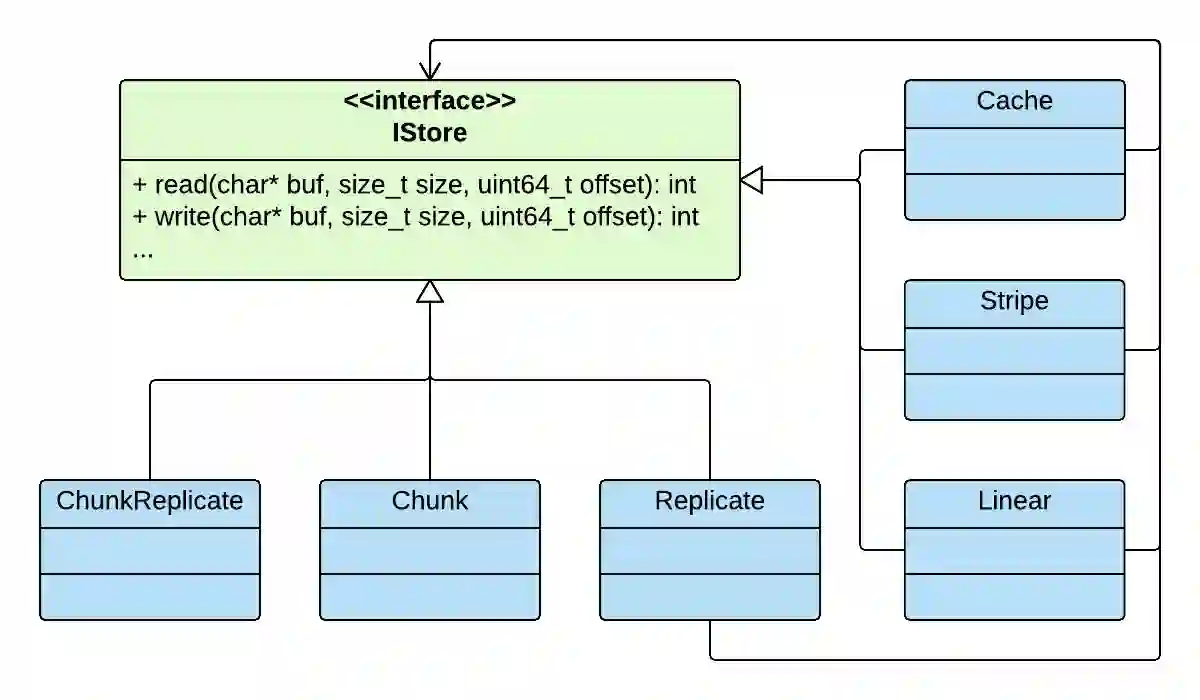 如下图所示,Ursa中的I/O功能模块的组织采用decorator模式,即所有模块都实现了IStore抽象接口,其中负责直接与Chunk Server通信的模块属于decorator模式中的concrete component,其余模块均为concrete decorator。所有的decorator都保存数量不等的指向其他模块的指针(IStore指针)。