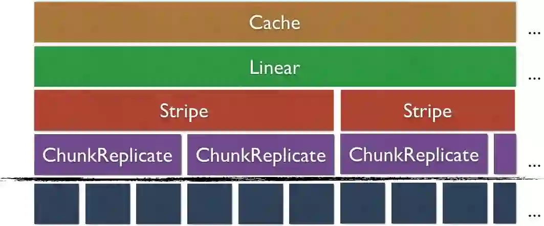 如图所示,Ursa中的存储结构与GFS/HDFS相似,存储卷由64MB(可配置)大小的chunk组成。Ursa系统中的数据复制、故障检测与修复均在chunk层次进行。系统中,每3个(可配置)chunk组成一组,互为备份。每2个chunk组构成一个stripe组,实现条带化交错读写,提高单客户端顺序读写性能。Ursa在I/O栈上层添加Cache模块,可将最常用的数据缓存在客户端本地的SSD介质当中,当访问命中缓存时可大大提高性能。