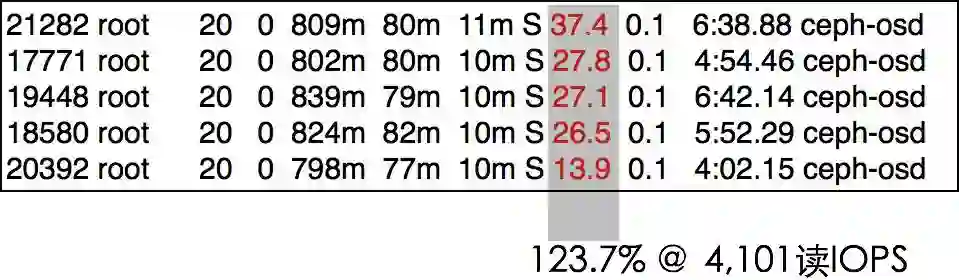 从测试来看,Ceph的读吞吐率正常,然而写吞吐率不足读的1/3,性能偏低;读写延迟比显著大于网络延迟与磁盘I/O延迟之和;CPU占用率过高。
