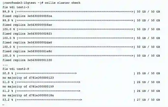 在执行压力测试一周后,对集群中的全部数据进行一致性检测(collie cluster check),发现有些数据块副本与另外2个不一致(“fixed replica ...”),有些数据块的3个各不相同(“no majority of ...”):