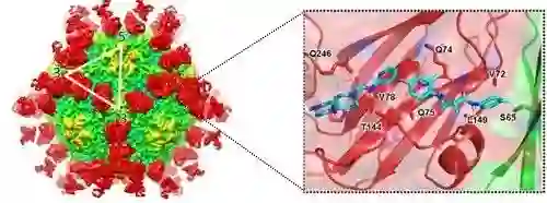 众所周知,中和性抗体与病毒复合物精细三维结构的研究是确定其精确结合位点最直接、高效的技术手段,对于揭示机体免疫抑制机制及抗病毒药物的研发起到至关重要的作用。基于此,相关研究人员筛选分离得到了四株高中和活性的抗体。通过进一步的实验发现这四株中和性抗体和之前分离得到的R10中和性抗体一样能高效地抑制病毒与宿主细胞的结合。之后研究人员采用低温冷冻电镜单颗粒重构技术解析了四株中和性抗体与HAV复合物的高分辨率三维结构。通过对复合物结构比较发现,这几株中和性抗体均围绕在五次轴周围,结合在衣壳蛋白五聚体边缘,位于二次轴和三次轴之间,横跨两个五聚体,识别HAV衣壳蛋白上由VP3和VP2的共同组成的空间构象型表位,同时通过比较发现这一抗原表位在人源的6种HAV基因型中都极其保守。此外,研究人员观察到,抗原表位的大部分氨基酸分布在一个“沟壑”两旁,之前的研究证明该区域是受体结合的潜在位点。这些特性都表明该区域是个理想的小分子抑制剂结合靶点。针对这个靶点,研究人员在单克隆抗体的重链中选择了对衣壳蛋白结合有重要贡献的四个氨基酸残基作为药效团进行建模,并利用这一药效团模型在DrugBank库中进行了大规模的计算机模拟药物筛选。之后通过体外抑制实验,从中筛选到一个抑制效果最佳的先导药物——golvatinib (IC50约为1uM)。相关功能实验证明该小分子并不引起HAV颗粒稳定性改变,而是通过阻断HAV与细胞表面受体的结合进而起到抑制HAV感染的作用。最后研究人员根据分子对接的结构从原子水平分析了其抑制机理,为进一步改造这一先导化合物提供了理论依据。研究人员基于全病毒颗粒抗原表位结构进行药物设计与筛选的这一策略,对于发现针对其他人类重大疾病相关病毒的药物开发是十分值得借鉴的。