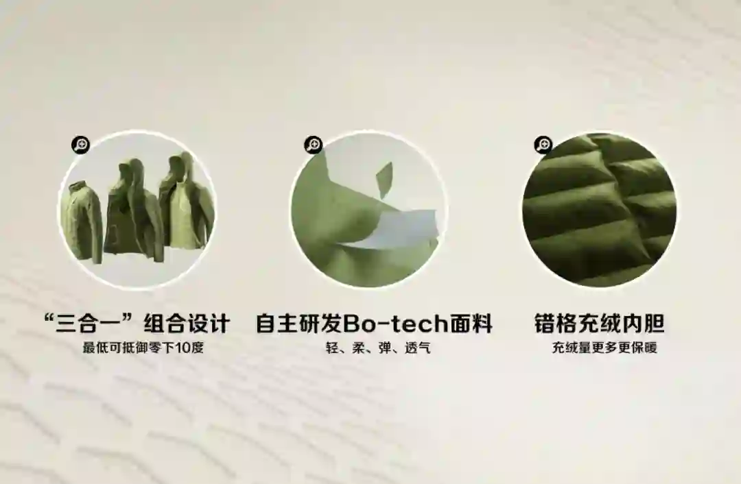 迎接户外风潮,波司登从消费者场景需求切入,对这次舒适户外羽绒服系列的外观进行了大幅焕面。例如在版型的拓展上,波司登舒适户外系列产品采用三合一组合设计,通过精研百万亚洲人体型,分别将15种版型差异化地运用在三合一的外套与内胆中,以迎合当下审美语境的舒适裁剪,演绎多种穿搭法则。在颜色择选上,亦摒弃硬核户外羽绒服跳跃的亮色,将低饱和的米、灰、绿等颜色纳入色盘,兼容户外场合的同时也适合通勤等都市场合穿着。