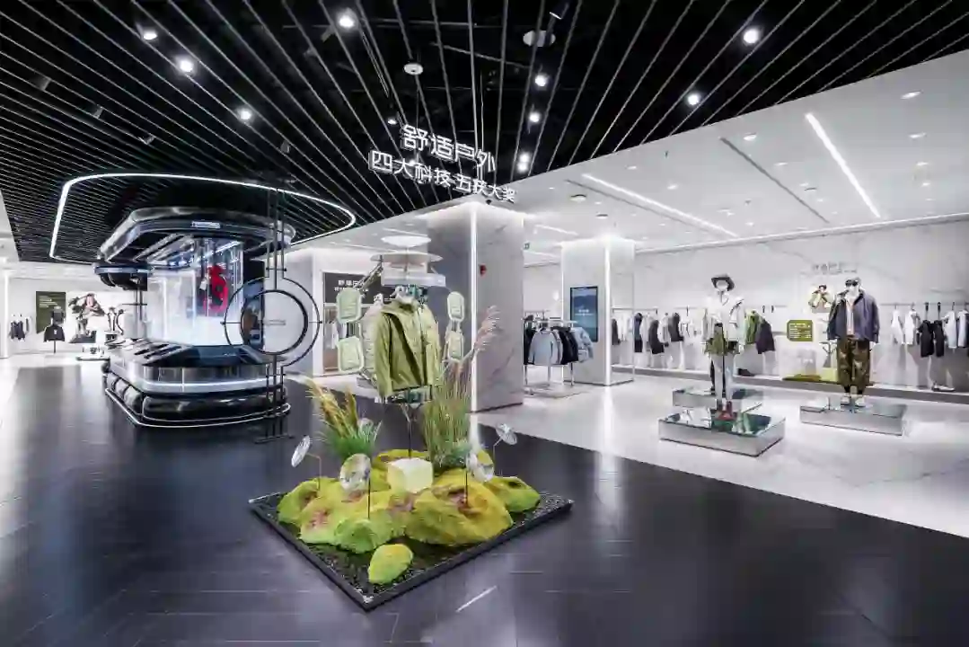 回看中国市场,波司登最近也在上海落下首家全球体验店。这座占地2000多平,高达三层的零售空间被划分为羽绒科技体验中心、场景体验中心和会员体验中心。除了超大型「365羽绒硬核科技装置」吸引消费者打卡,这家全球体验店还展示了波司登在国内外大秀现场的高定服装,用设计师专区还原了波司登设计师在设计「首创波司登风衣羽绒服」的工作场景,全面加深时尚与科技的完美融合。
