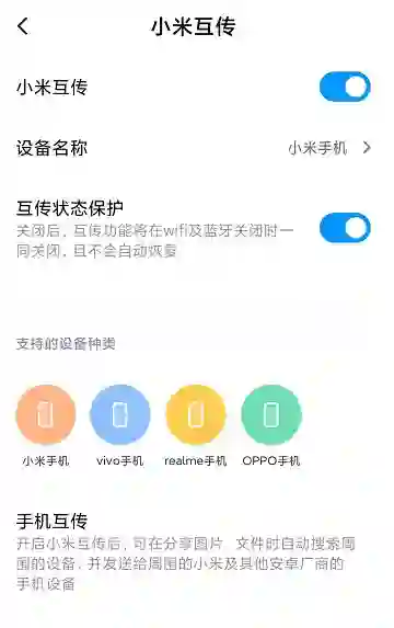 在更新到 MIUI 11 后,小米手机就可以向支持协议的机型互传了。