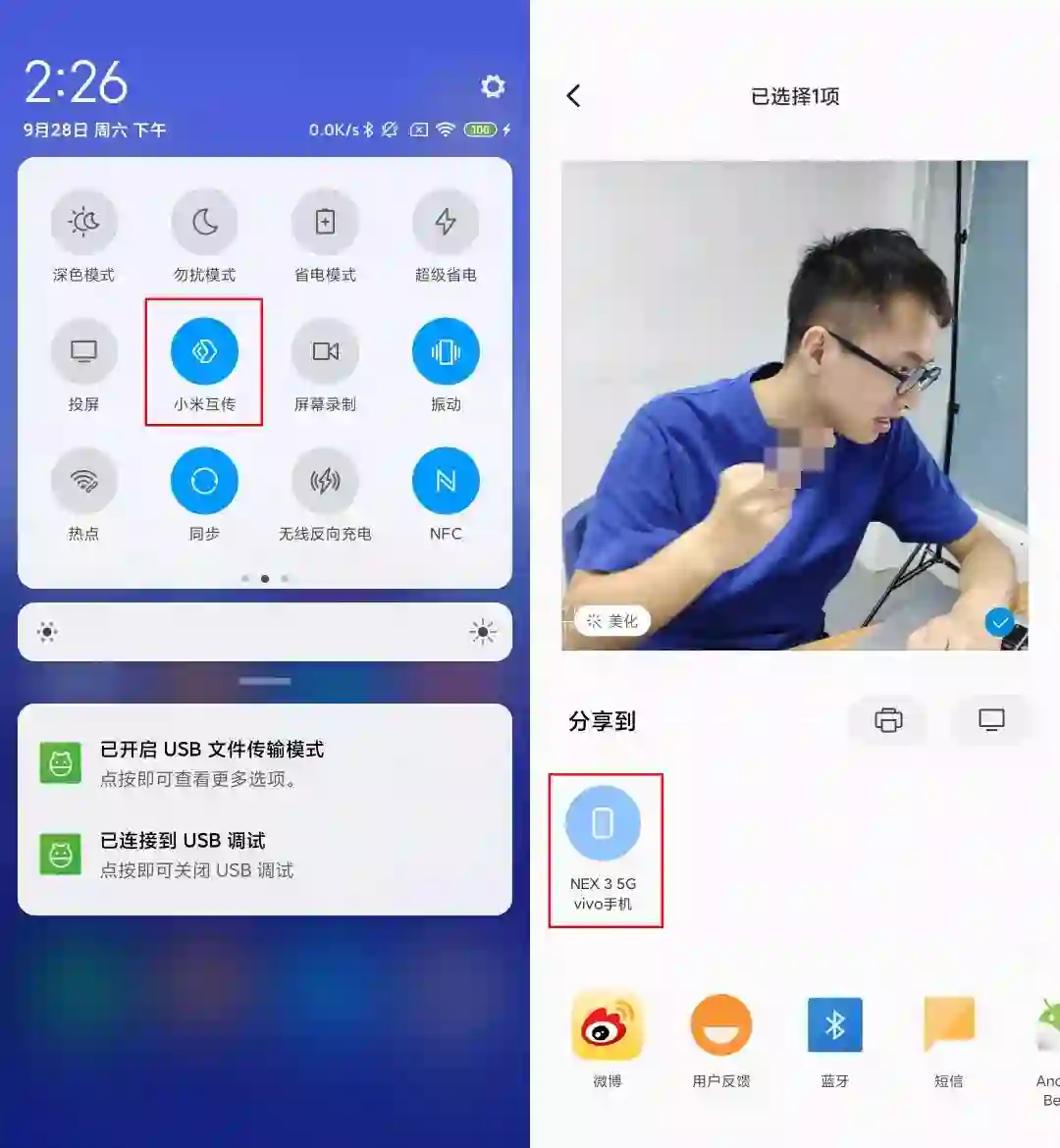 只要两台手机都启用了互传功能,传文件真的就一下子的事儿。