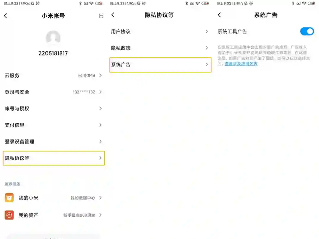 入口就是:「设置→小米账号→隐私协议等→系统广告→系统工具广告」
