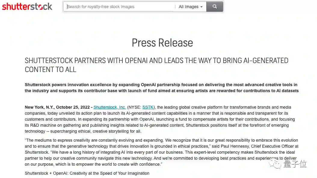 「我们很高兴Shutterstock通过我们的API向客户出售 DALL-E的图像,这是首个批次的部署动作,期待未来合作。」