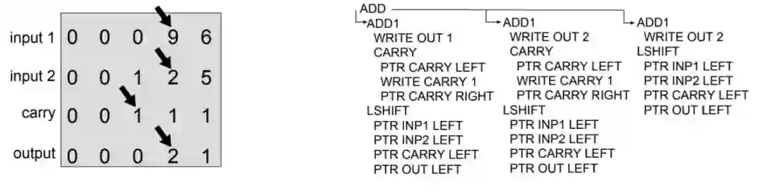 之前的所有模型从设计上看都是联结主义。现在,我们将尝试两个模型:神经编程器 [17] 和Neural RAM [16],仅使用明确定义的数据变换。具体来说,控制器不向内存发送直接可读/写的指令,而是对数据执行一种可能的一元/二元运算,如基本算术(如加、乘)、逻辑运算符(如相等比较、小于)和聚合运算符(最小、最大)。这两种模型可以能够运行的时间步可多于仅描述问题的必要时间步数。这使得模型能够组合这些基本运算,创建复杂程序。