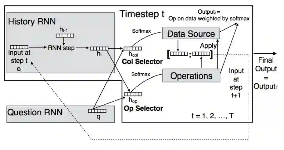 两种模型存在一些有趣的差异。神经编程器设计为使用自然语言输入。当然,它们通过RNN控制器变成向量化的嵌入格式,但是该模型仍然需要学习英语的语义。类似地,神经编程器具备使之在存储上执行数据库类型运算的模块,该模型可从数据库中返回多个元素。从这个层面上看,神经编程器是为了成为一个自动问答系统,学习回答问题所需的潜在程序。因此,解决方案可能是综合的,但是比问题中存在表征的情况需要的步骤要少一些。
